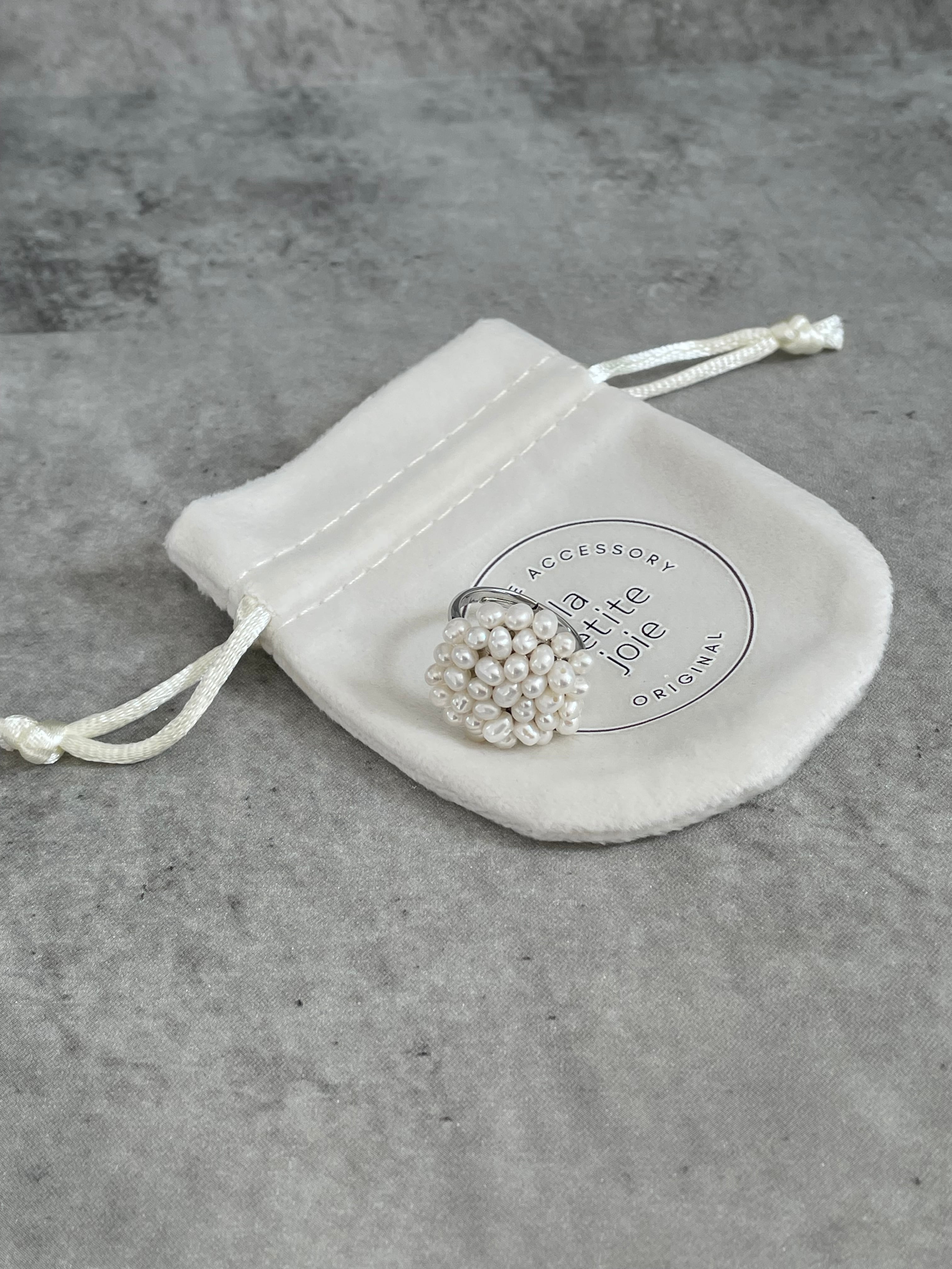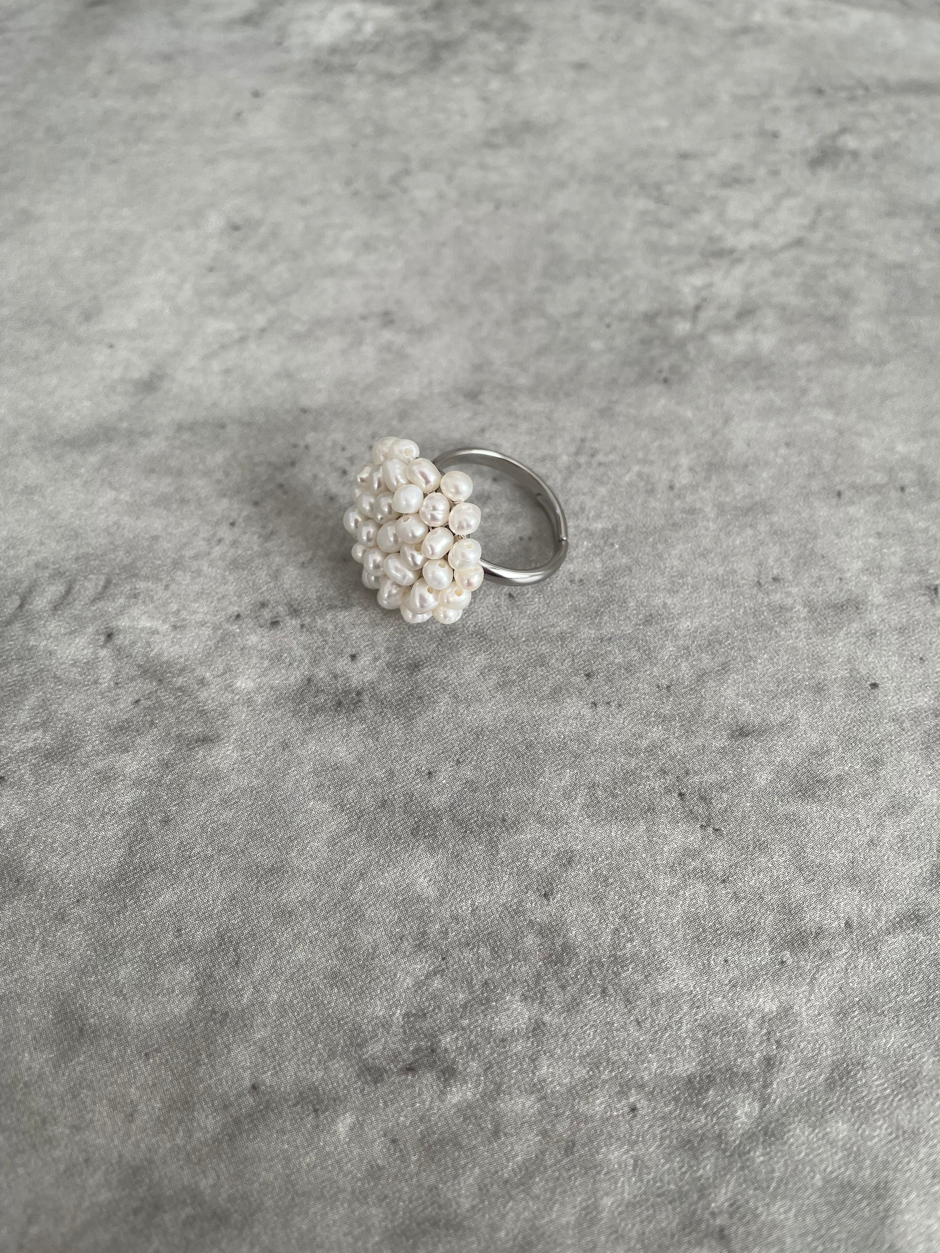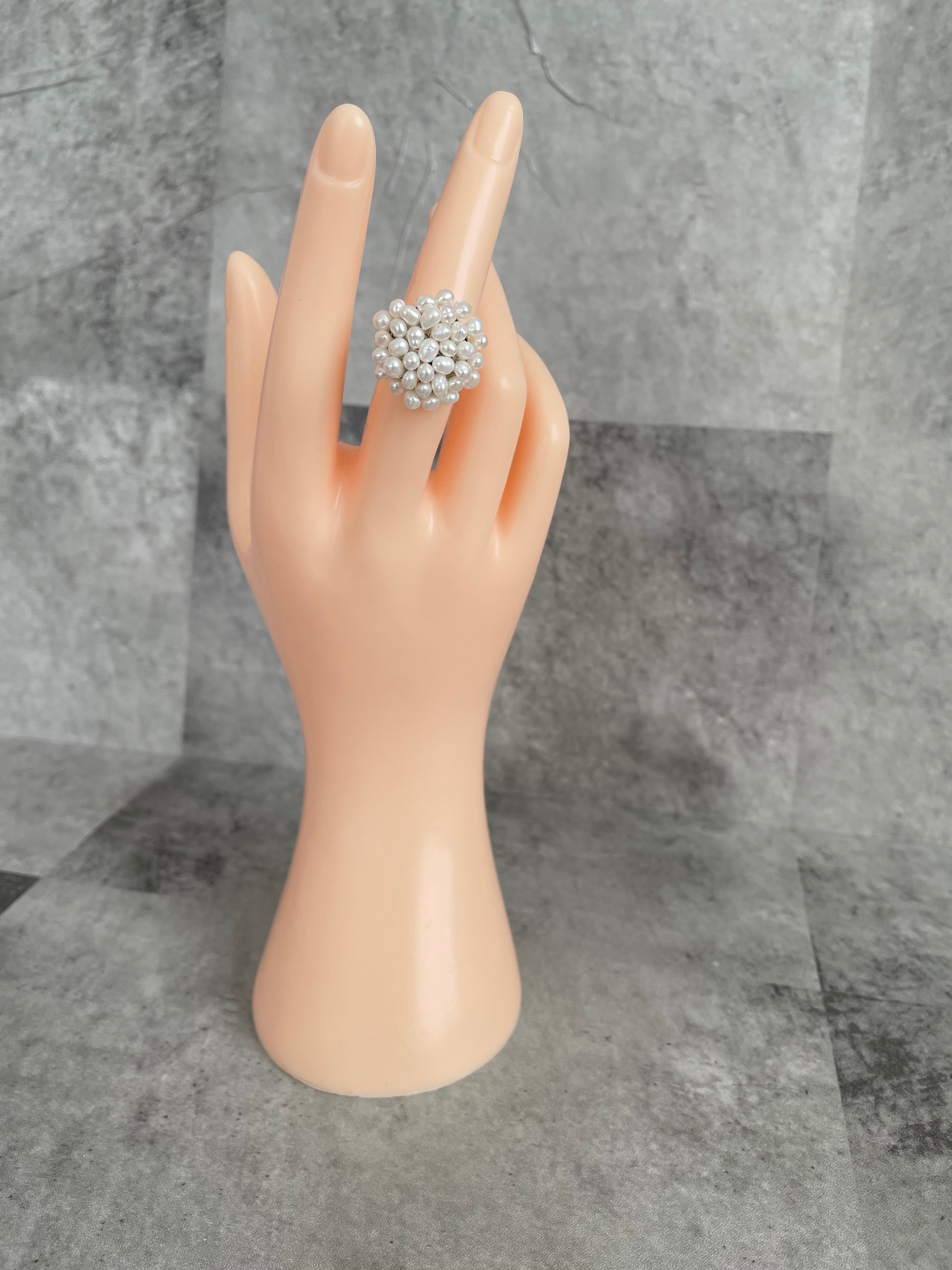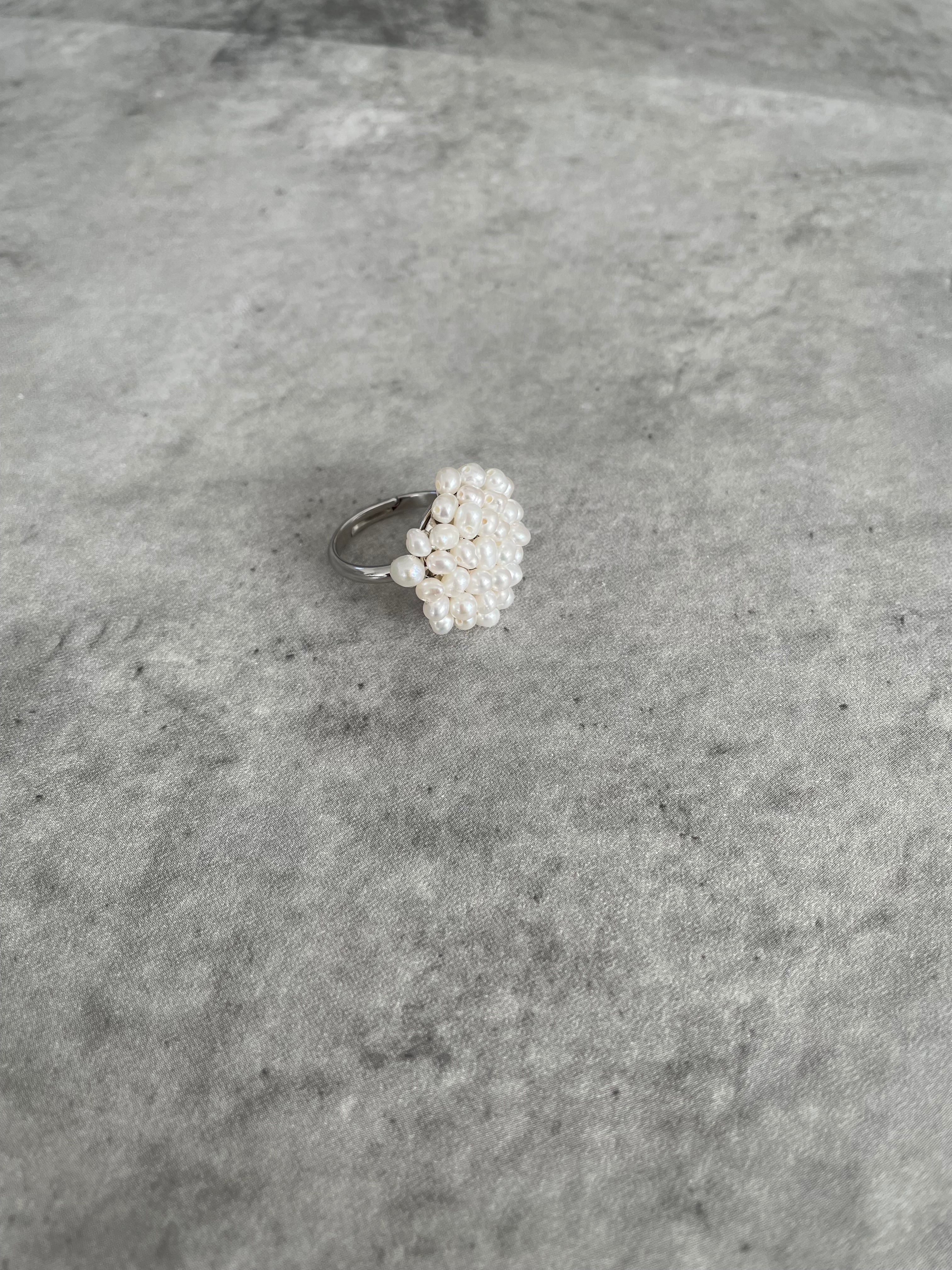 このブーケのようなパールリング(ホワイト)は、優雅なデザインと艶やかなパールの輝きが特徴で、指元に華やかさを添えてくれます。まるでブーケのような小さなパールが組み合わさった上品なリングです。