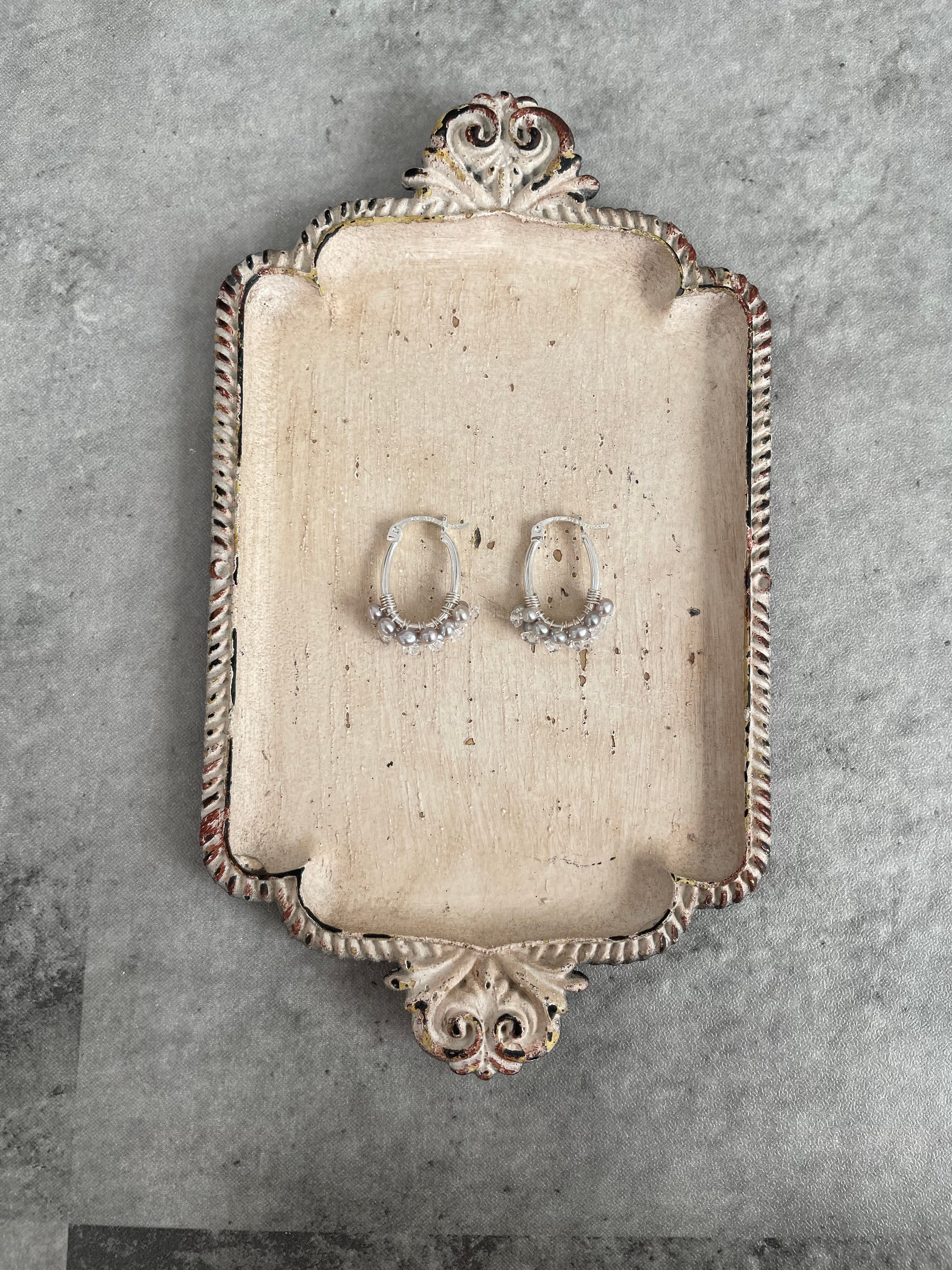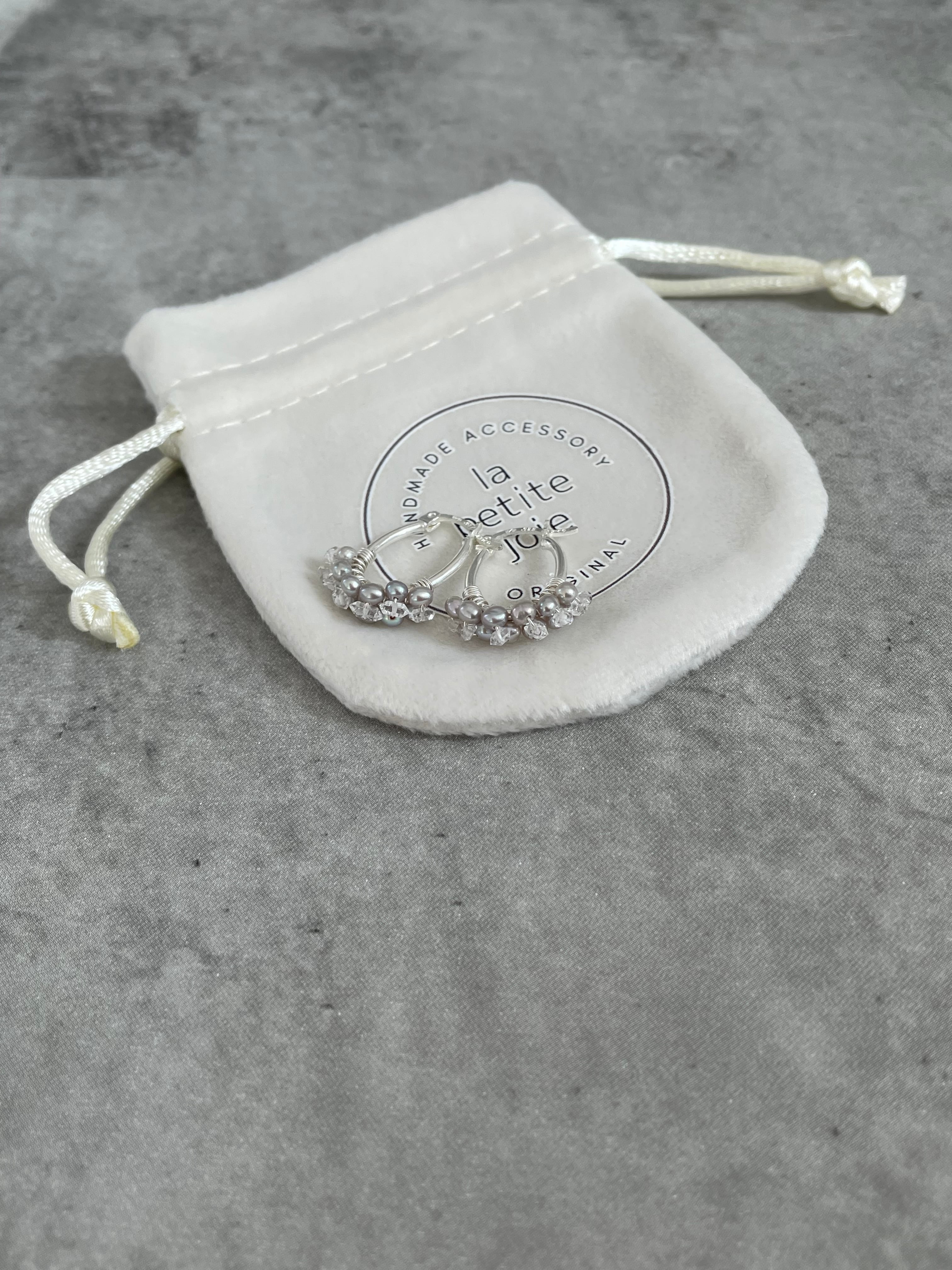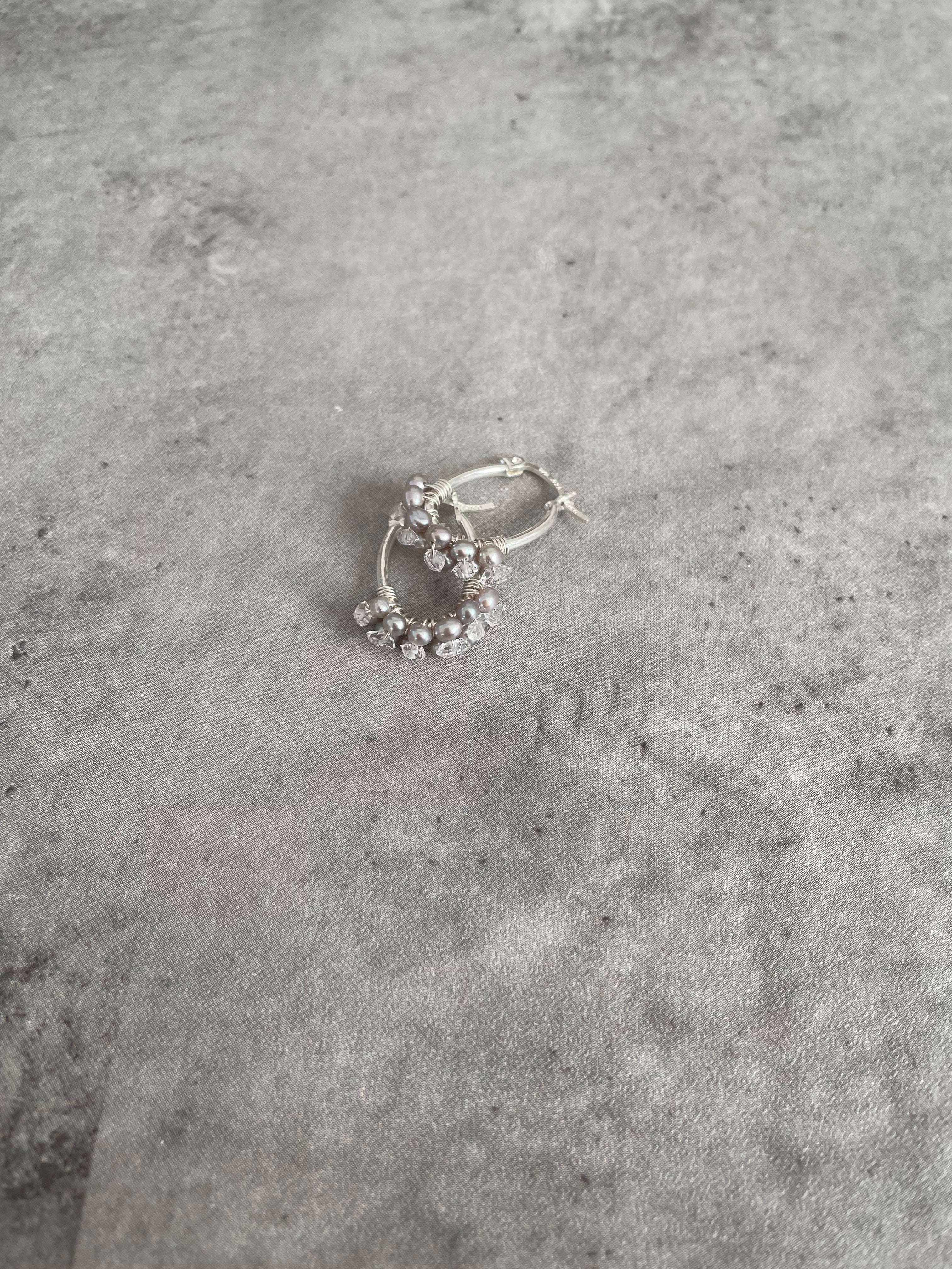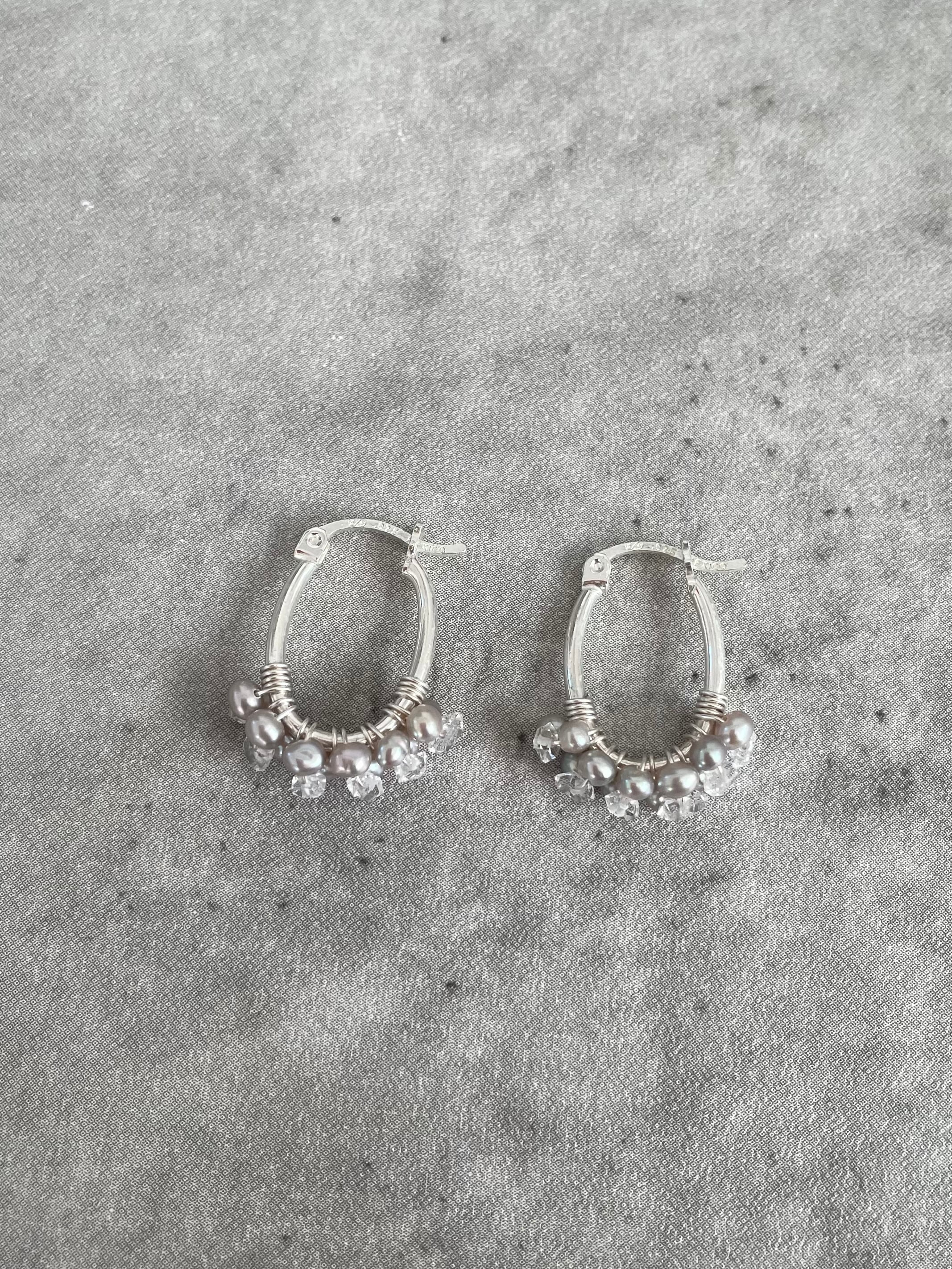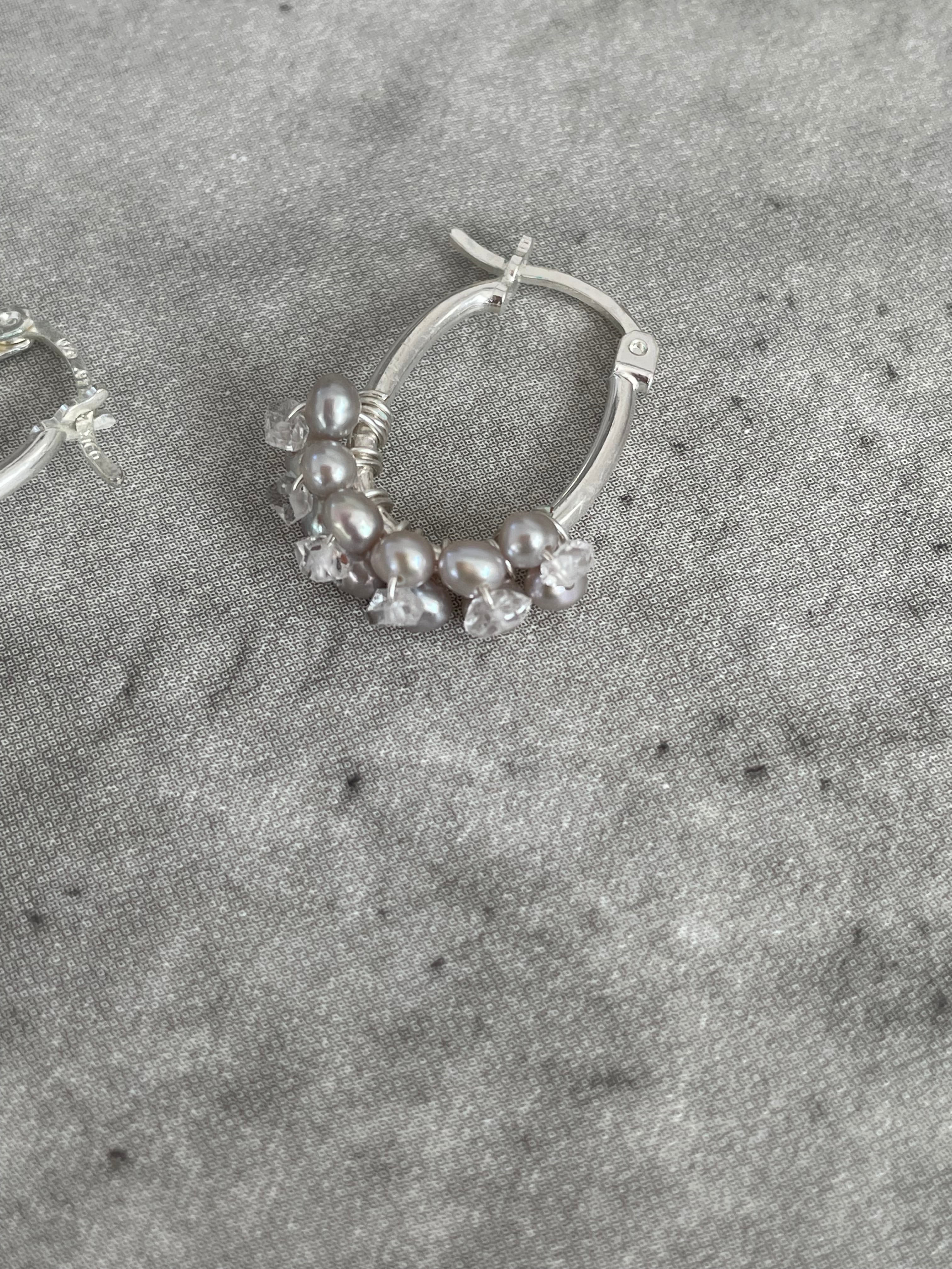 このパールの粒々フープピアスは、優雅なデザインと艶やかなパールとハーキマー水晶の輝きが魅力で、耳元に華やかさを添えてくれます。まるでお花のような小さなパールとダイヤの様な輝きのハーキマー水晶をフープに巻き付けた華奢でありながらも存在感のあるフープピアスです。
